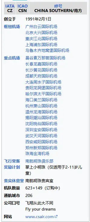 Established on 1 July 1988 following the restructuring of CAAC Airlines that acquired and merged a number of domestic airlines, the airline became the world’s sixth-largest airline measured by passengers carried and Asia’s largest airline in fleet size, revenue, and passengers carried. With its main hubs at Guangzhou Baiyun International Airport and Beijing Daxing International Airport, the airline operates more than 2,000 flights to more than 200 destinations daily and was a member of SkyTeam until 1 January 2019. The airline started a frequent flyer program partnership with American Airlines in March 2019. The logo of the airline consists of a kapok flower (which is also the city flower of Guangzhou) on a blue tail fin.[4] The company slogan is Fly towards your dreams (飞向您的梦想).