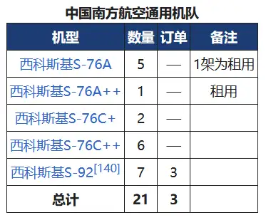 中国南方航空的通用航空业务主要由珠海直升机分公司负责,后者成立于1980年5月,是南航下属的全资子公司,在中国共有6个作业基地。公司主要为中外石油开采企业提供海上后勤飞行服务,并同时经营公务飞行、旅游飞行、物探飞行、护林飞行和空中摄影、电力巡线、吊挂、吊装组塔、医疗急救、港口引航、海上救助、飞机托管、飞行驾驶培训等业务[139]。公司现拥有直升机21架: