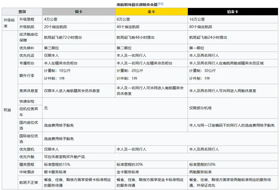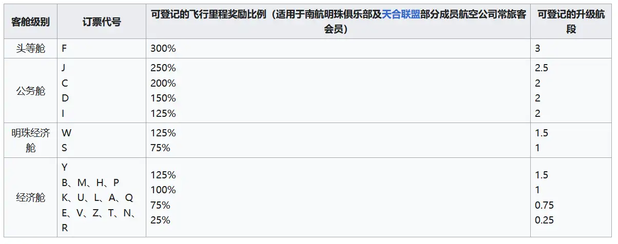 下表为南航各舱位的订票代号及飞行里程累计比例(2020年7月20日起)[93][94]: